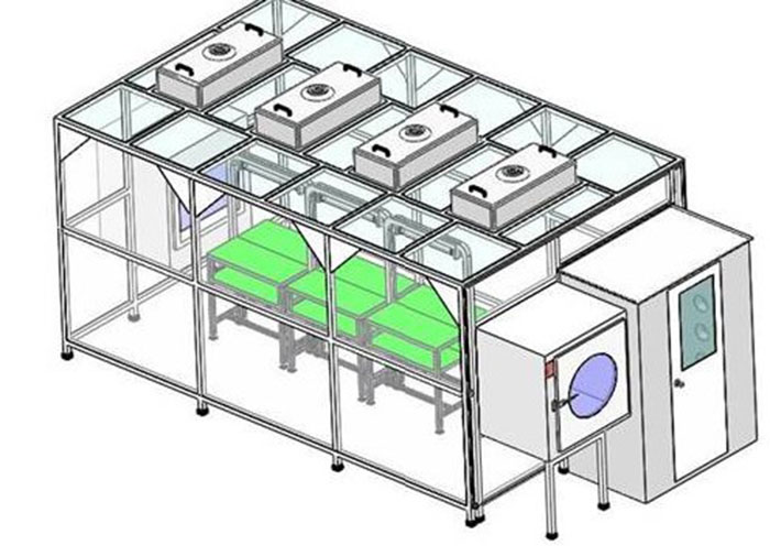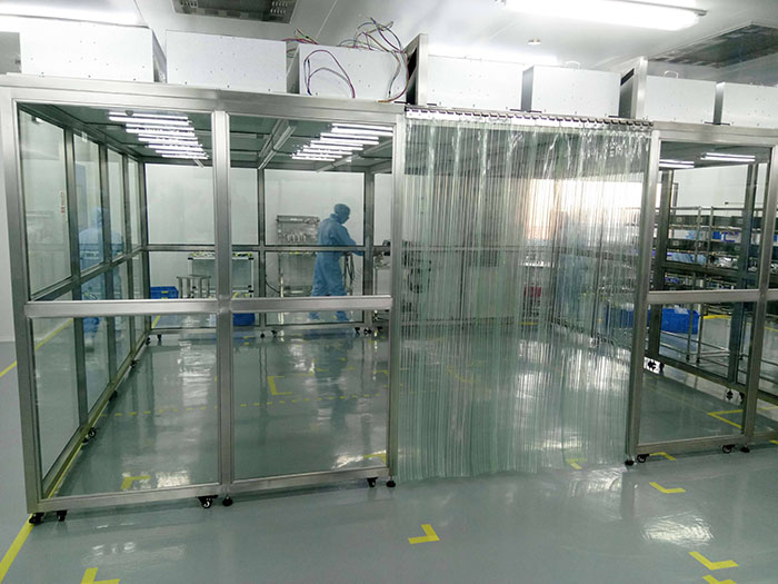 百級(jí)潔凈棚-無(wú)塵工作站一般以工業(yè)鋁材(不銹鋼方通、噴塑方通)做框架,采用風(fēng)機(jī)濾網(wǎng)機(jī)組FFU送風(fēng),四周采用防靜電垂簾,頂部鋪蓋密縫盲板,形成一個(gè)密縫區(qū),內(nèi)部?jī)艋?jí)別可達(dá)100---10萬(wàn)級(jí);特別適用于車間內(nèi)局部對(duì)潔凈度要求高的區(qū)域,如流水線作業(yè)區(qū)的高精確度產(chǎn)品組裝區(qū)。